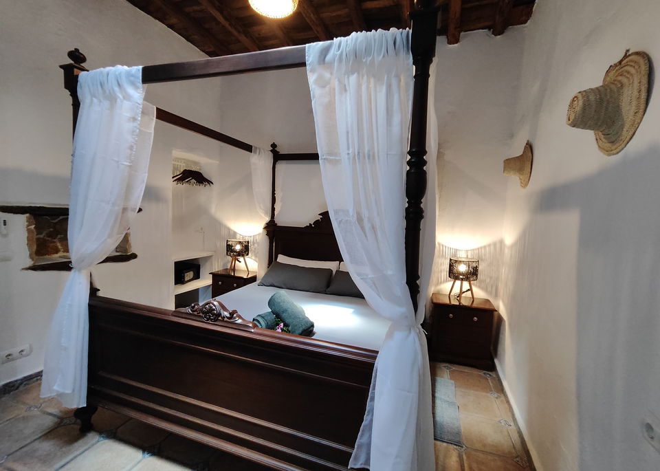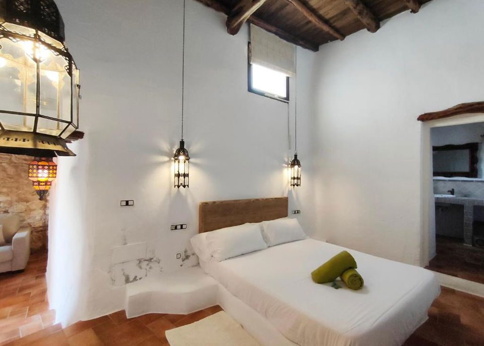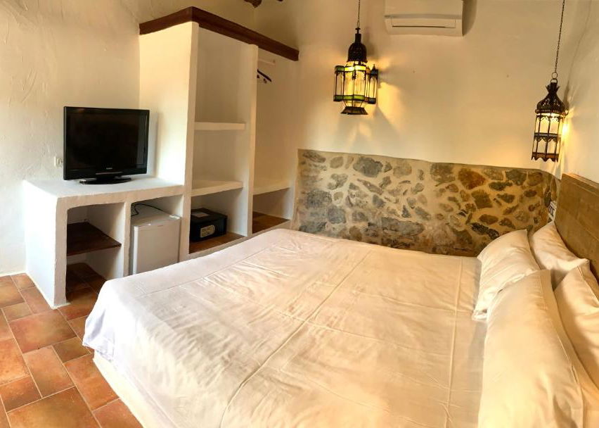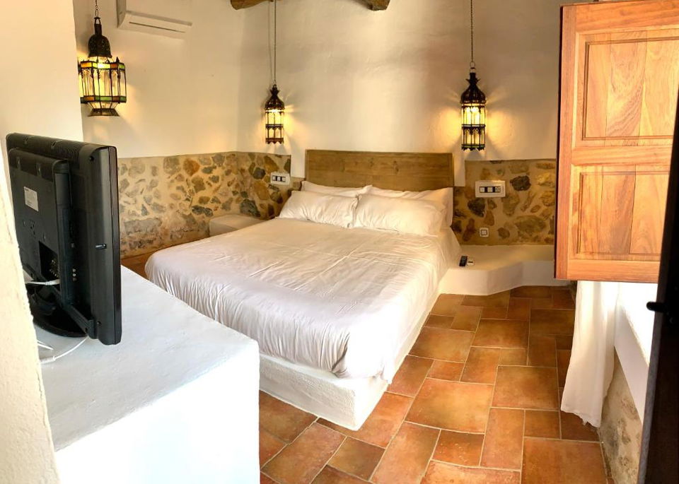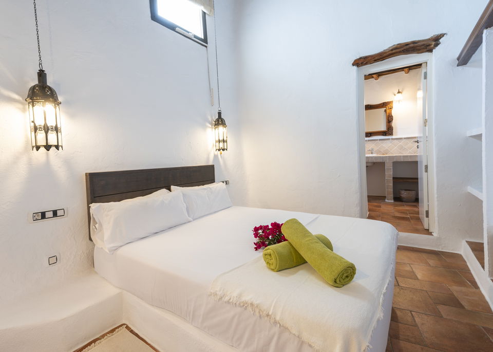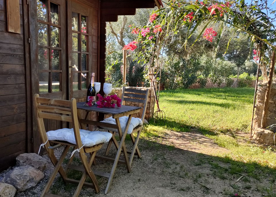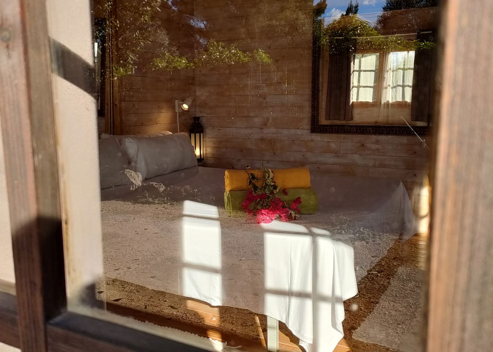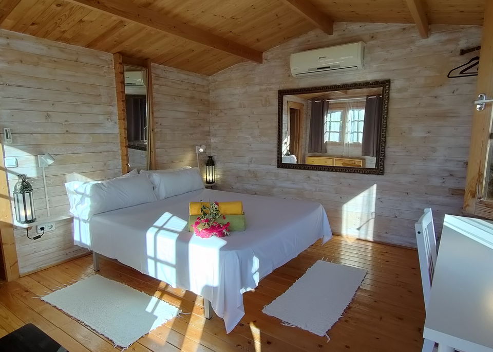 Para los amantes de la naturaleza que deseen disfrutar de estancia más rústica, situada aparte de la casa principal, alojarse en nuestro bungalow de madera puede ser una opción excelente. Esta casita de madera, de veinte metros cuadrados, es perfecta para dos personas. Dispone de una cama doble y de un baño con ducha, artículos de higiene personal, secador de pelo y toallas. También posee televisor de pantalla plana, aire acondicionado, wifi gratuito y minibar (de pago). Todas con cama doble, no divisible.